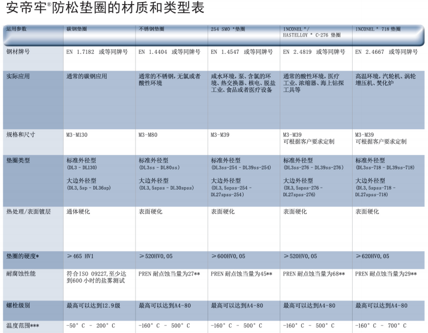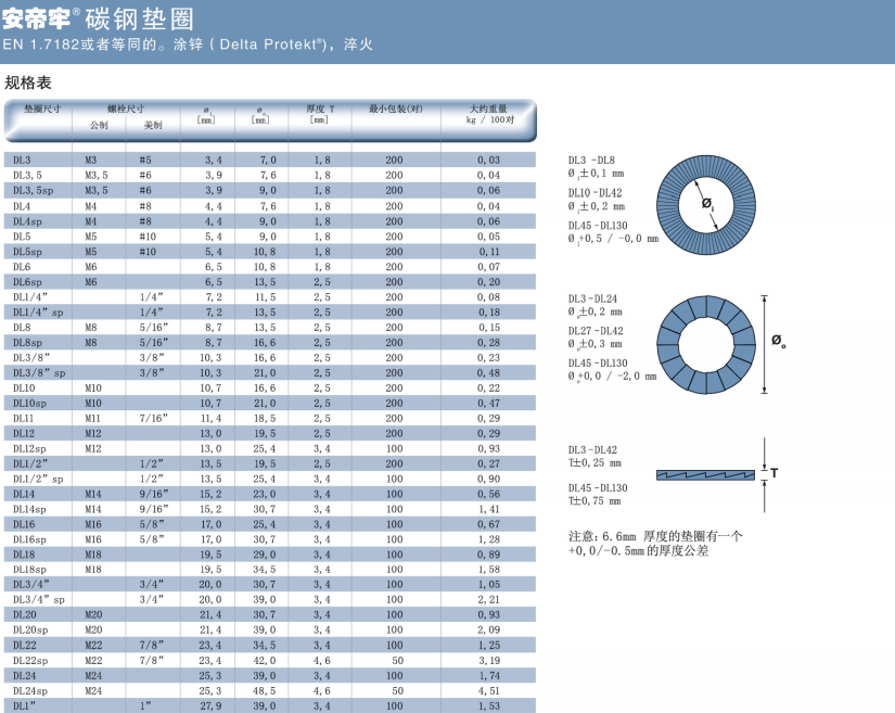 ANDI-LOCK防松墊圈提供以下材料和尺寸:碳鋼涂鋅墊圈 Delta Protekt(鋅薄片涂層 ),DL3-DL42(標(biāo)準(zhǔn)尺寸)和DL45-DL130(根據(jù)要求定制)。
